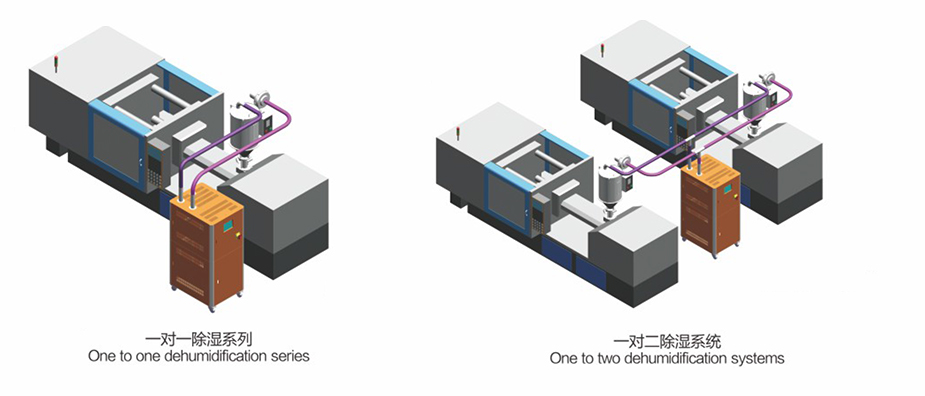 ● 一臺除濕機(jī)可以搭配數(shù)個獨立干燥料斗使用。